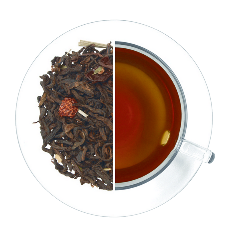 - Пу Эр Фитнес (Смесь чая Пуэр, зеленого мате и лемонграсса с добавлением кусочков плодов шиповника и яблок)