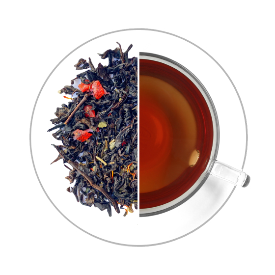 - Земляника со сливками (чай черный индийский, папайя, лист земляники, лепестки сафлора, ароматизатор)