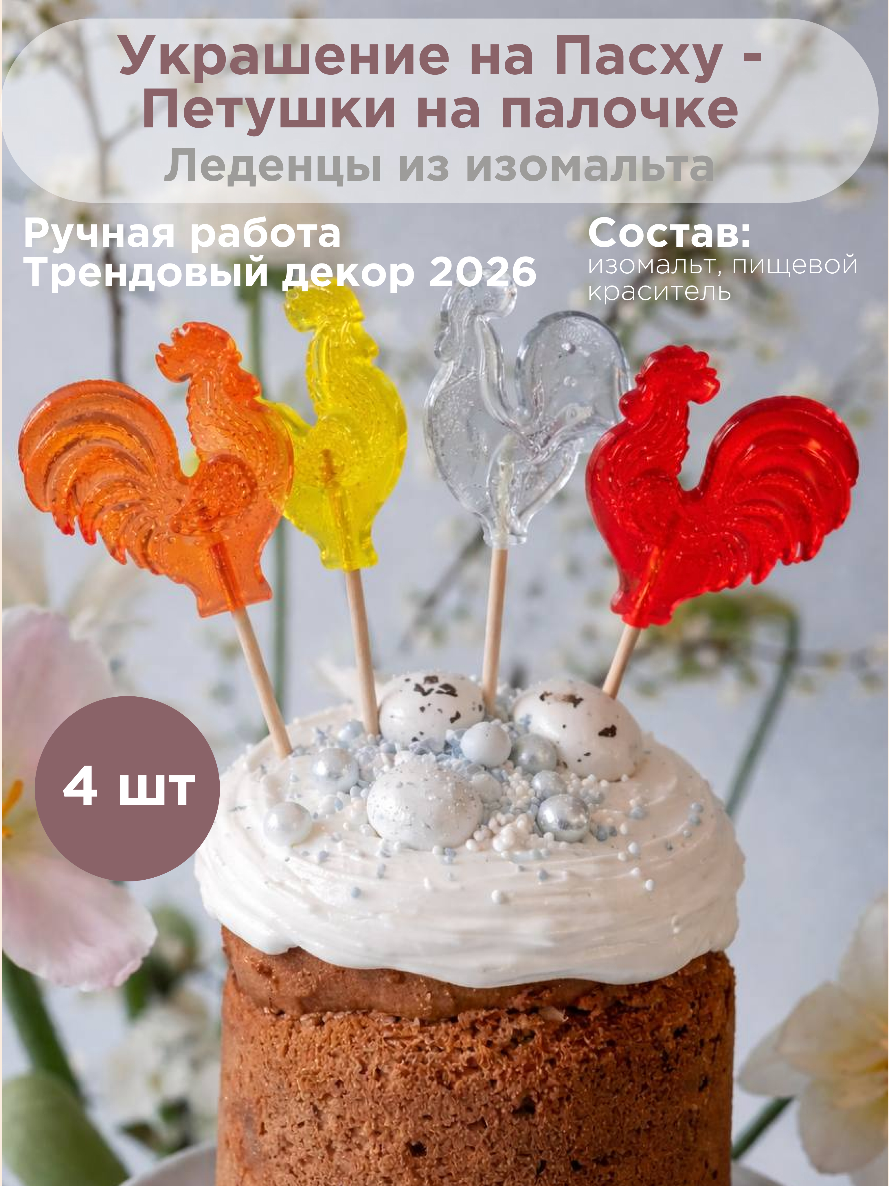 Ручная авторская работа гарантирует уникальность каждого элемента. Удобная картонная коробка вмещает четыре штуки, готовых дополнить праздничный стол или стать частью декора кулича.