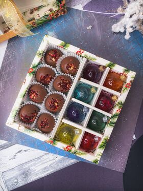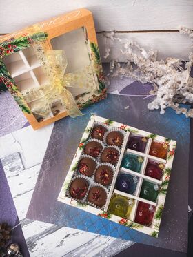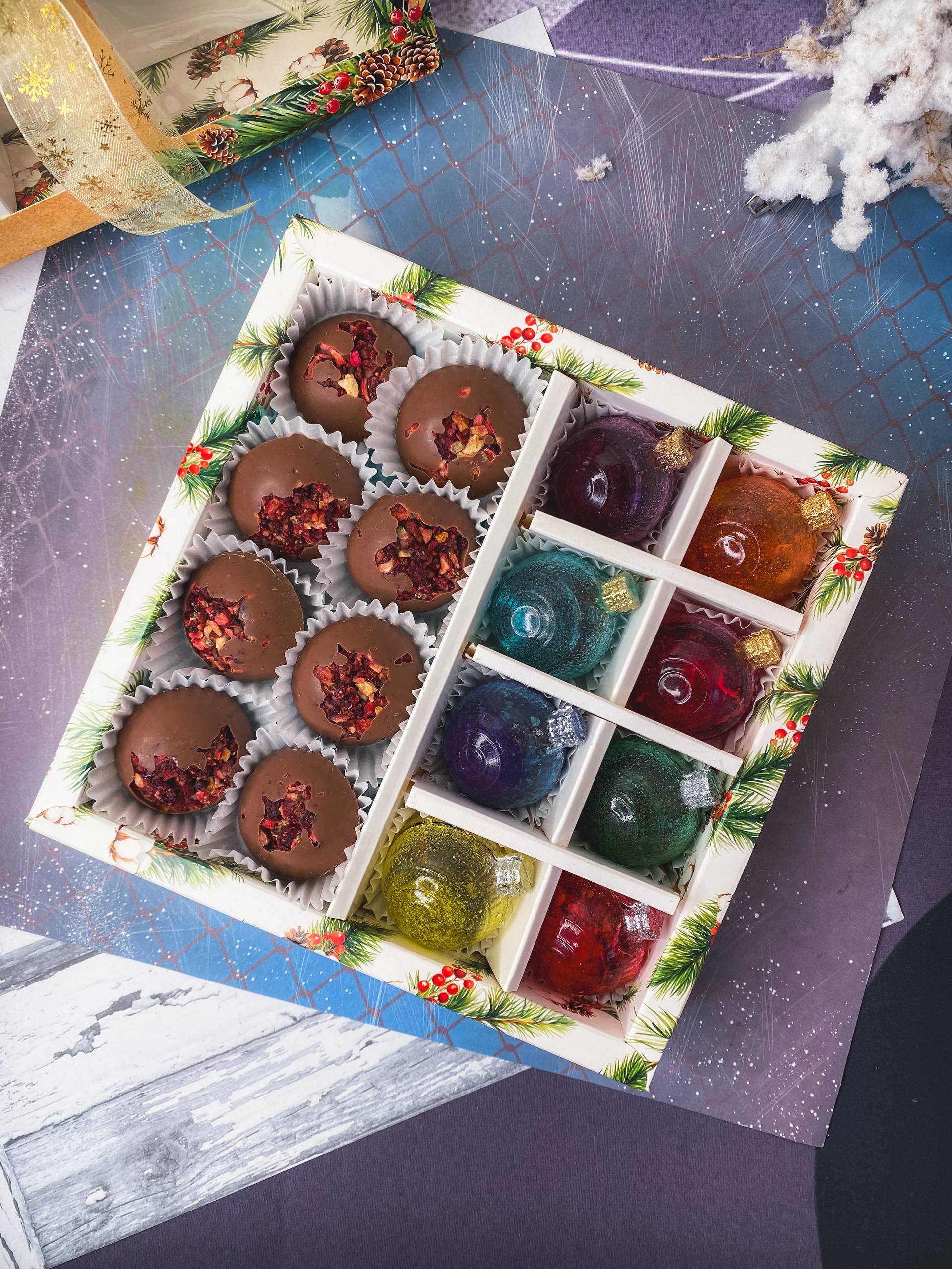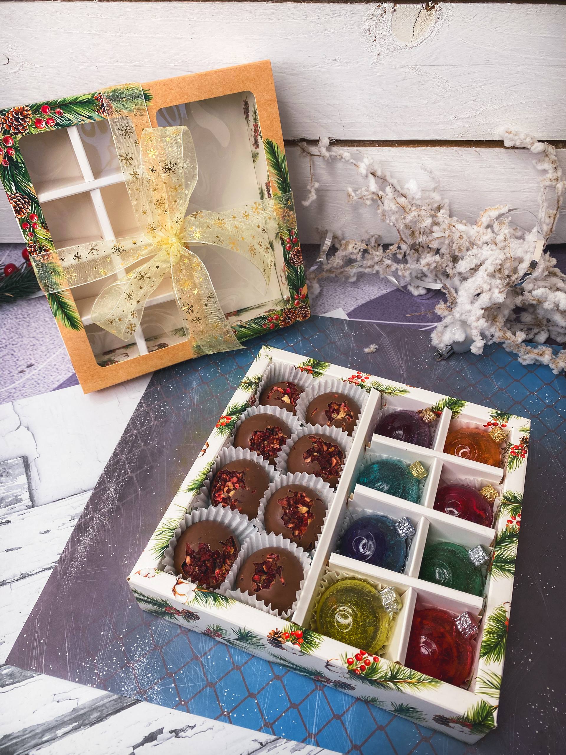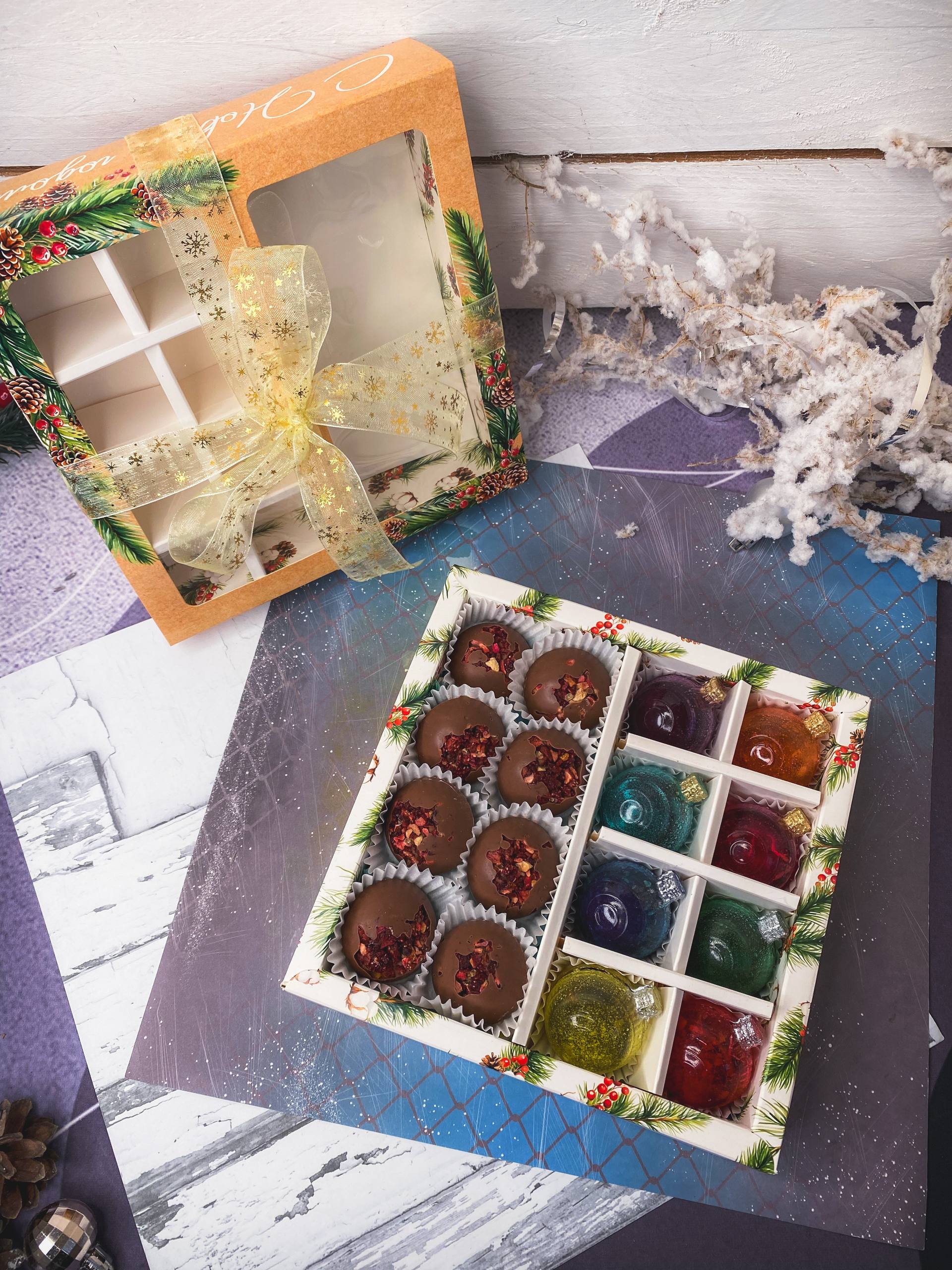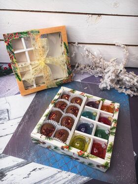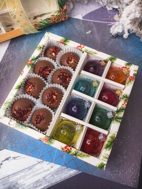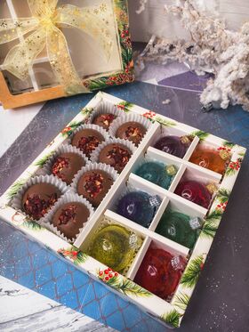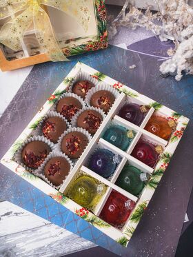 Подарочный набор состоит из восьми изысканных конфет ручной работы и чайных шаров. Такой набор подарит вам и вашим близким ощущение радости и волшебства.